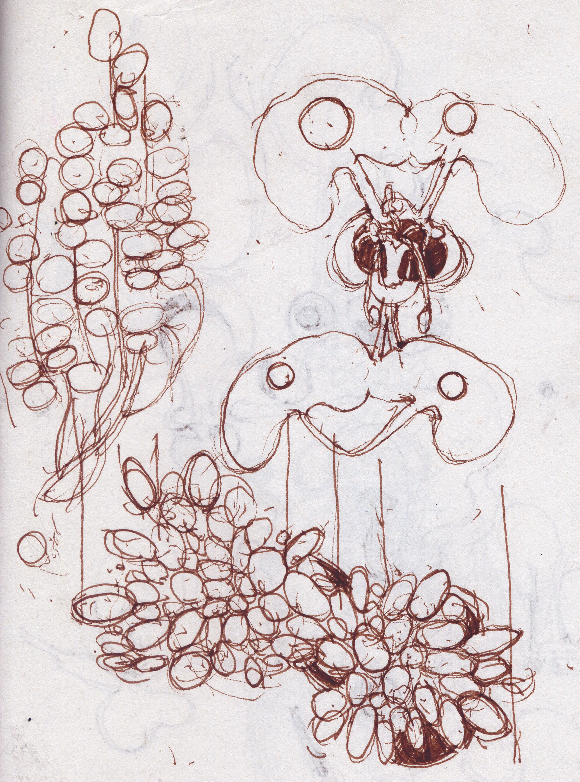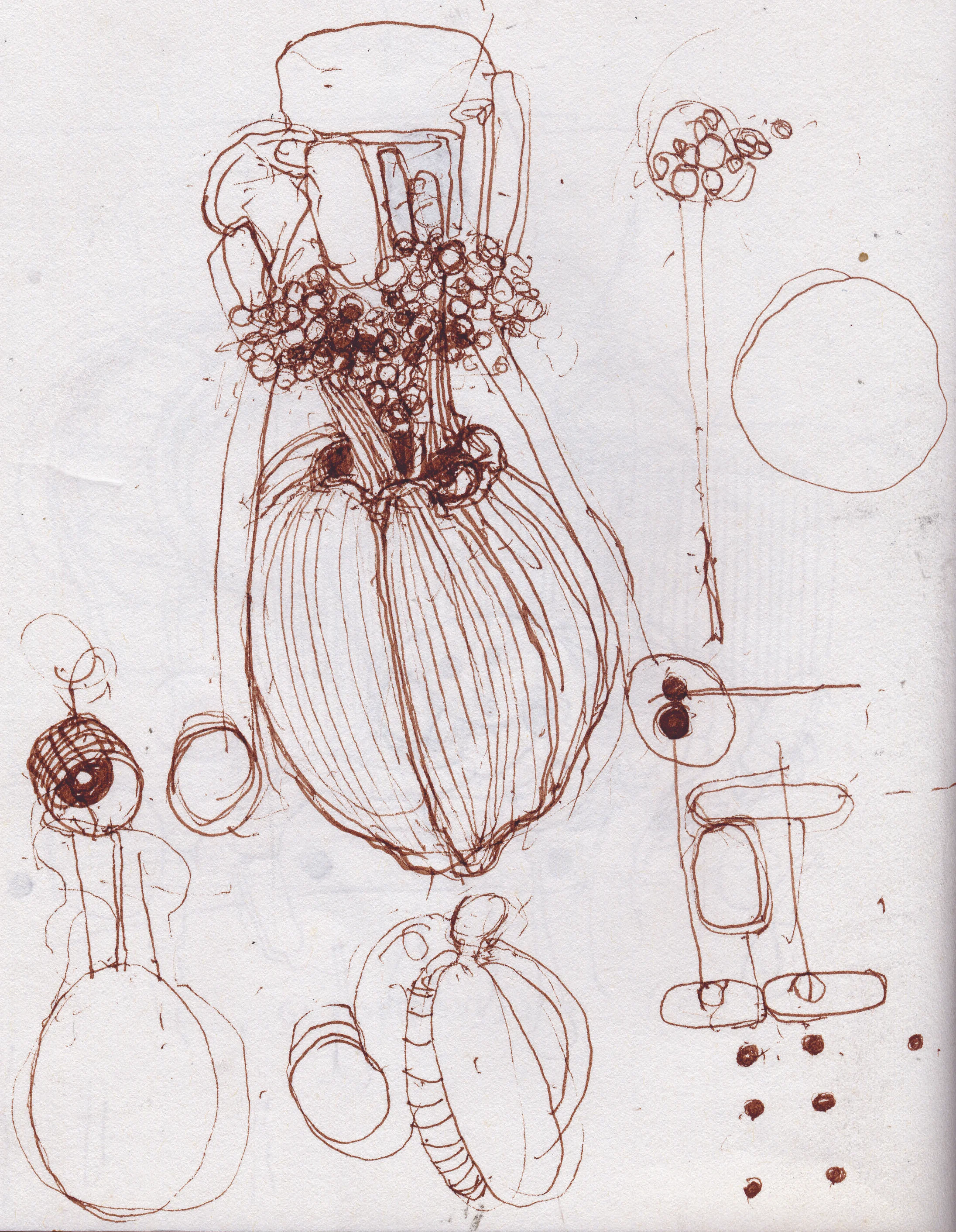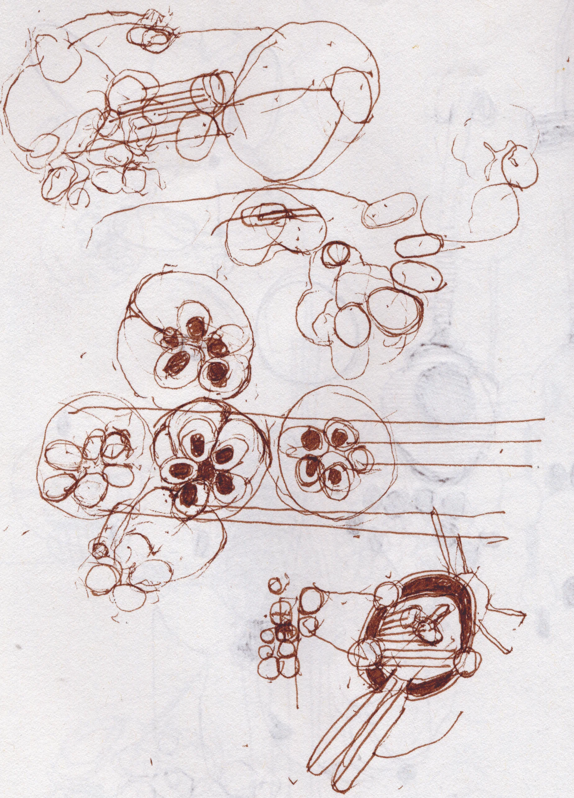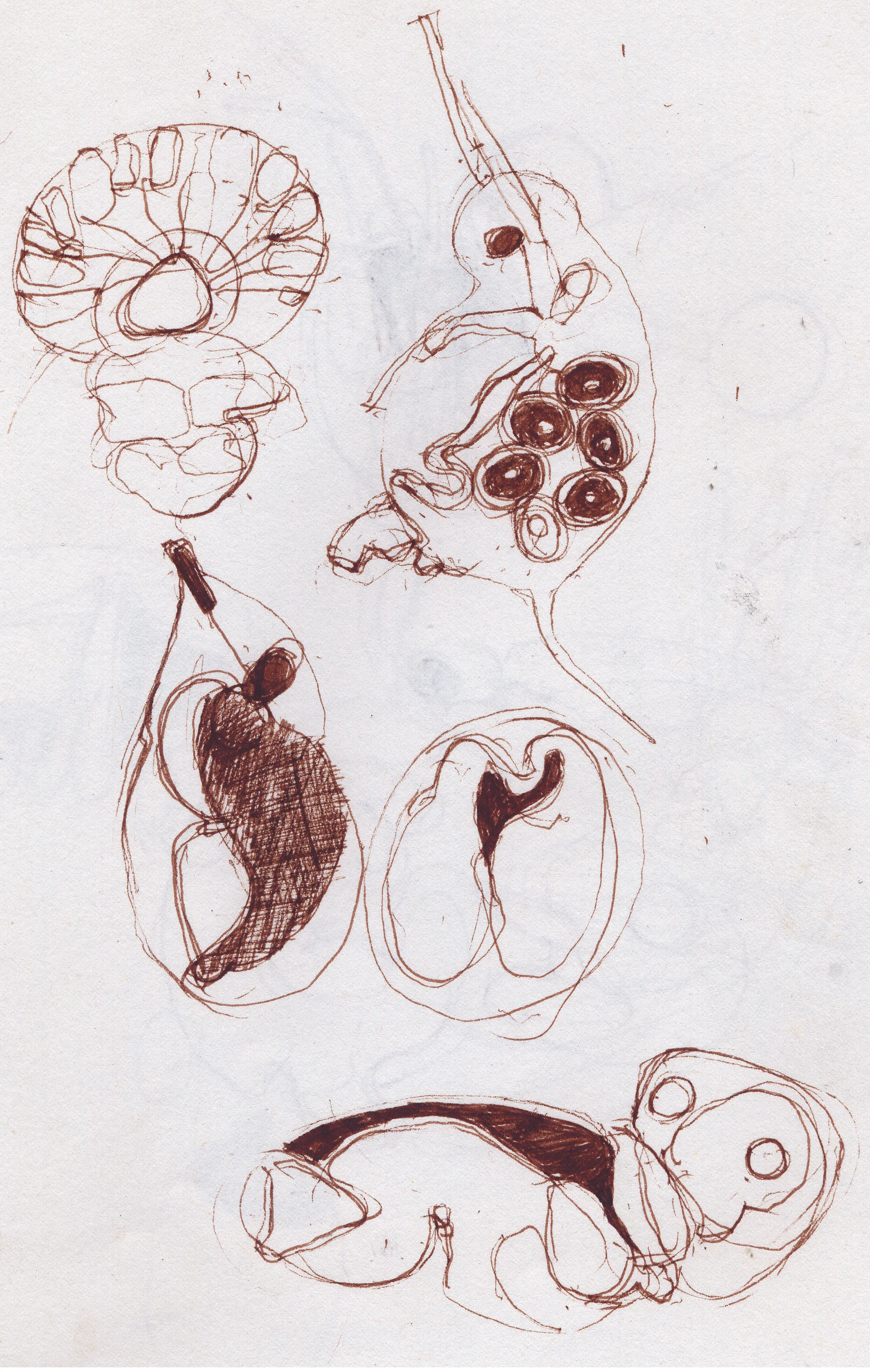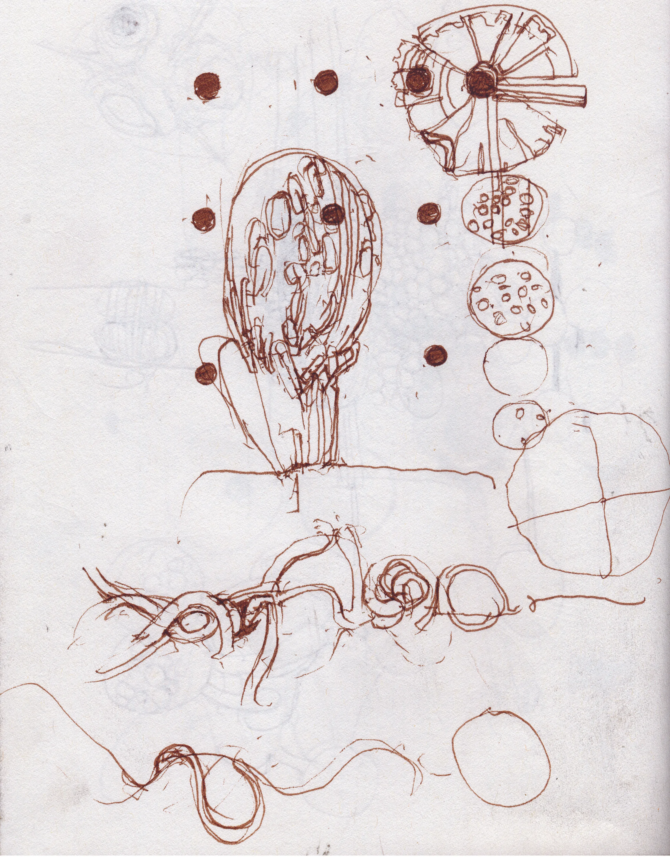 A selection of drawings in a sketchbook, derived from various books on plant life. Less observational or descriptive the drawings attempt to 'unpack' the graphic essence of the forms, shapes and the fluidity inherent in plants/flowers etc.