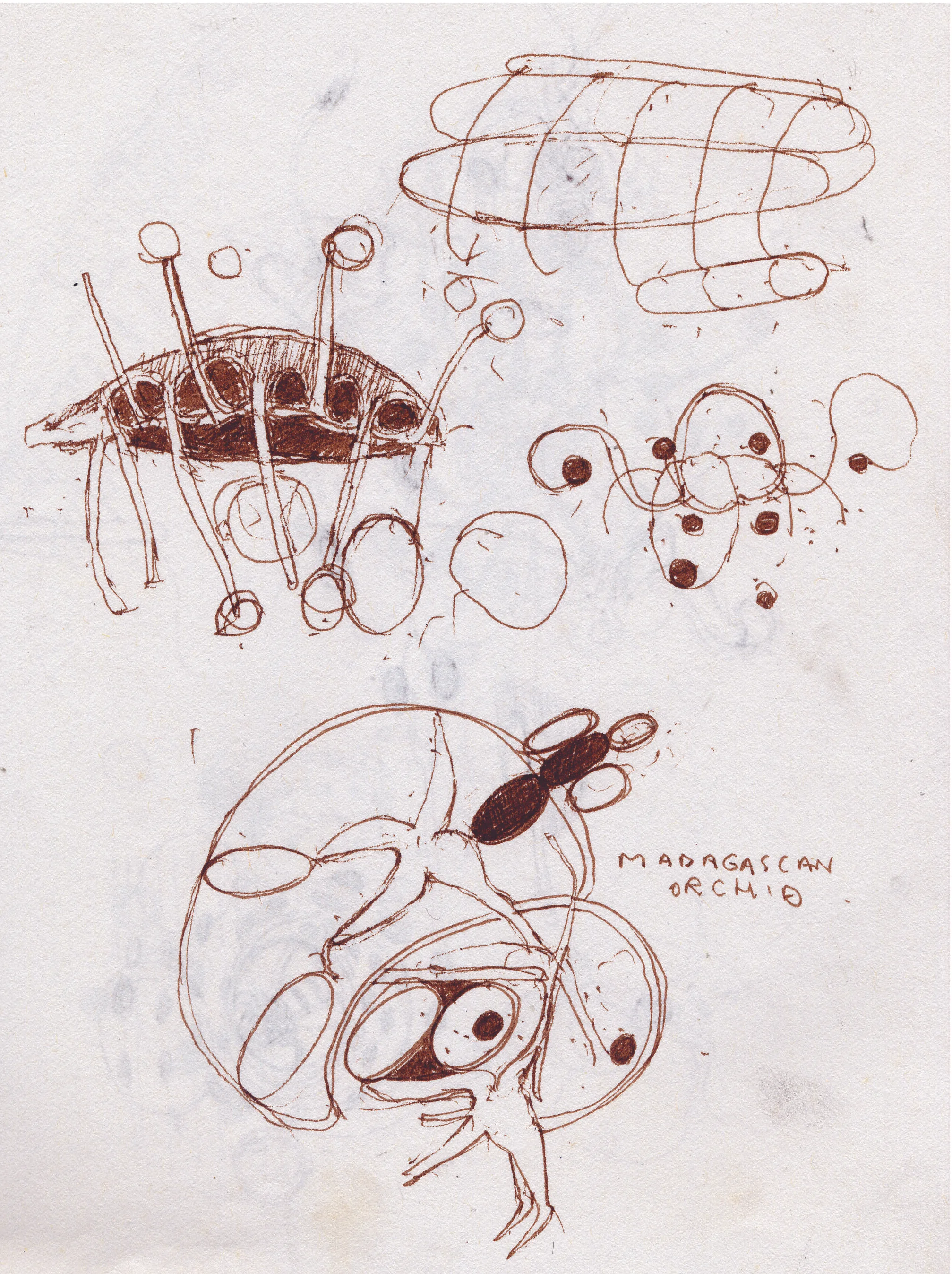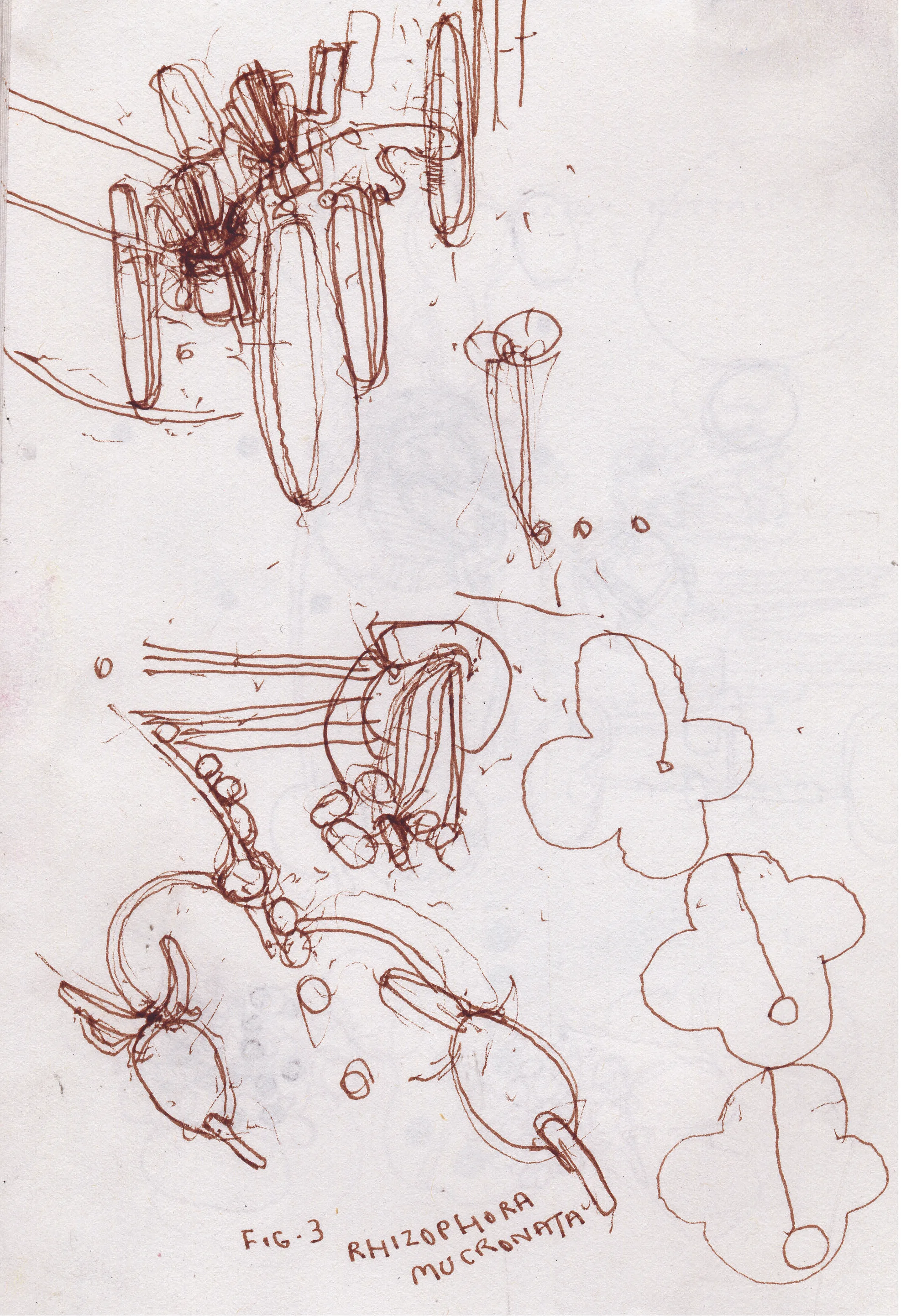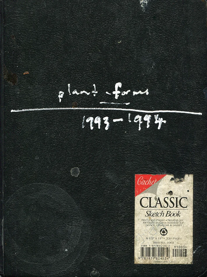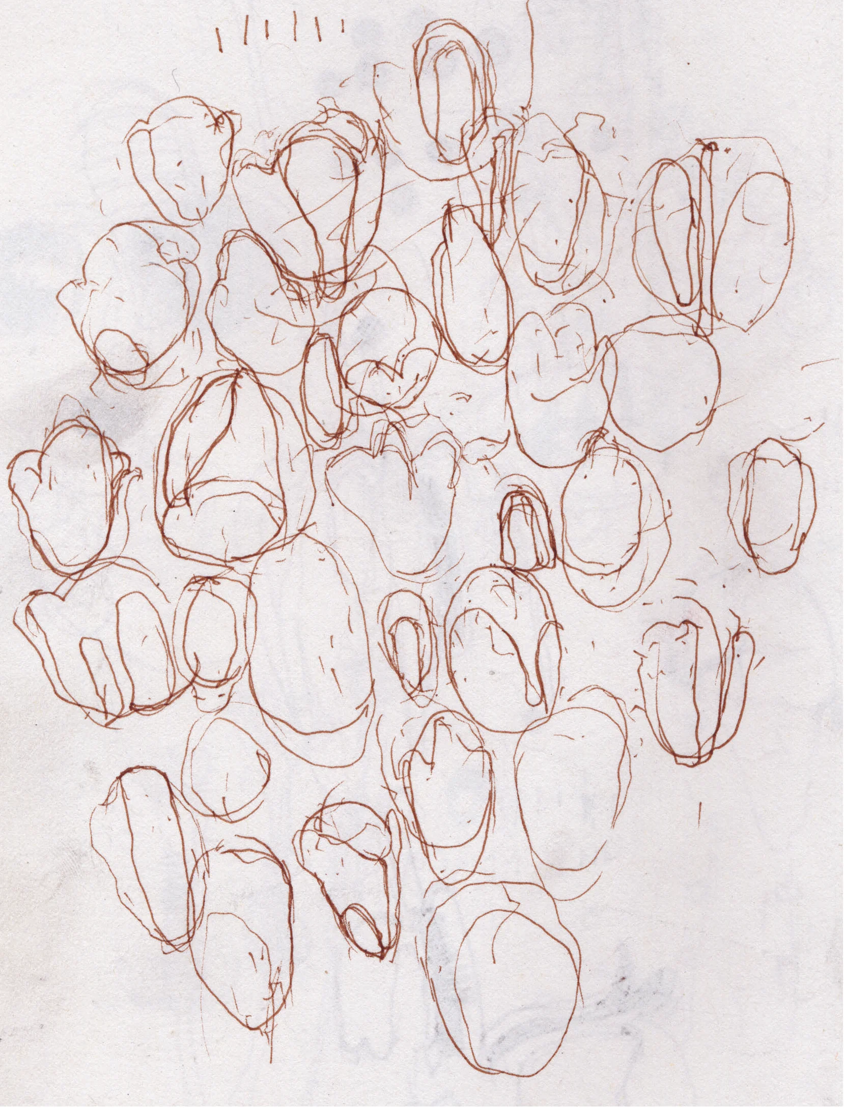 A selection of drawings in a sketchbook, derived from various books on plant life. Less observational or descriptive the drawings attempt to 'unpack' the graphic essence of the forms, shapes and the fluidity inherent in plants/flowers etc.